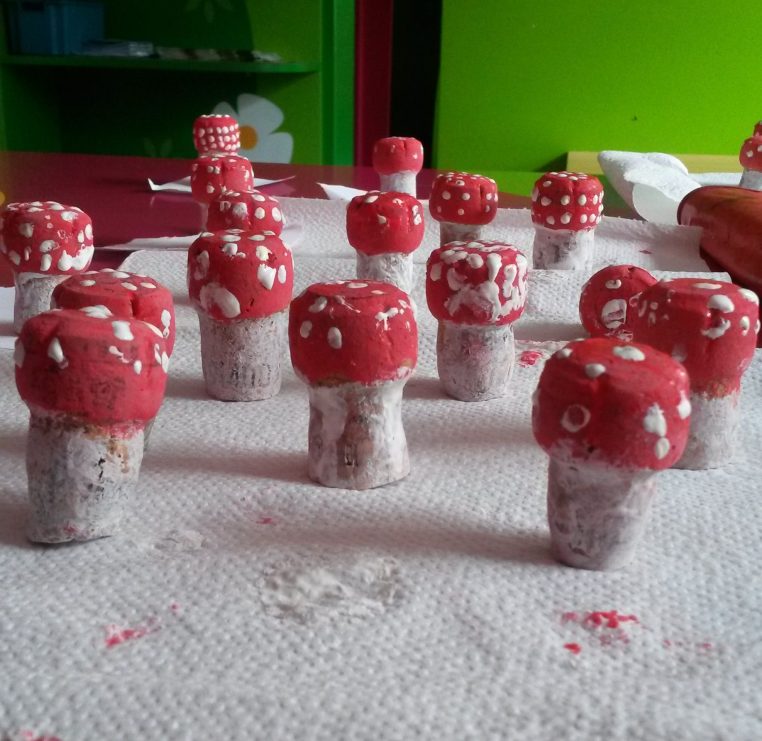 Die Donnerstagsgruppe war aktiv und hat aus alten Flaschenkorken lustige Fliegenpilze gebastelt.
